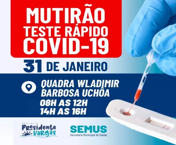 Os testes rápidos para COVID-19 permitem saber, em poucos minutos, se a pessoa está infectada ou se já teve contato com o coronavírus. Então, não perca essa oportunidade! Estamos disponibilizando, através da secretaria de saúde, testes rápidos dia 31 de janeiro. Marque na sua agenda! Avante, Presidente Vargas!